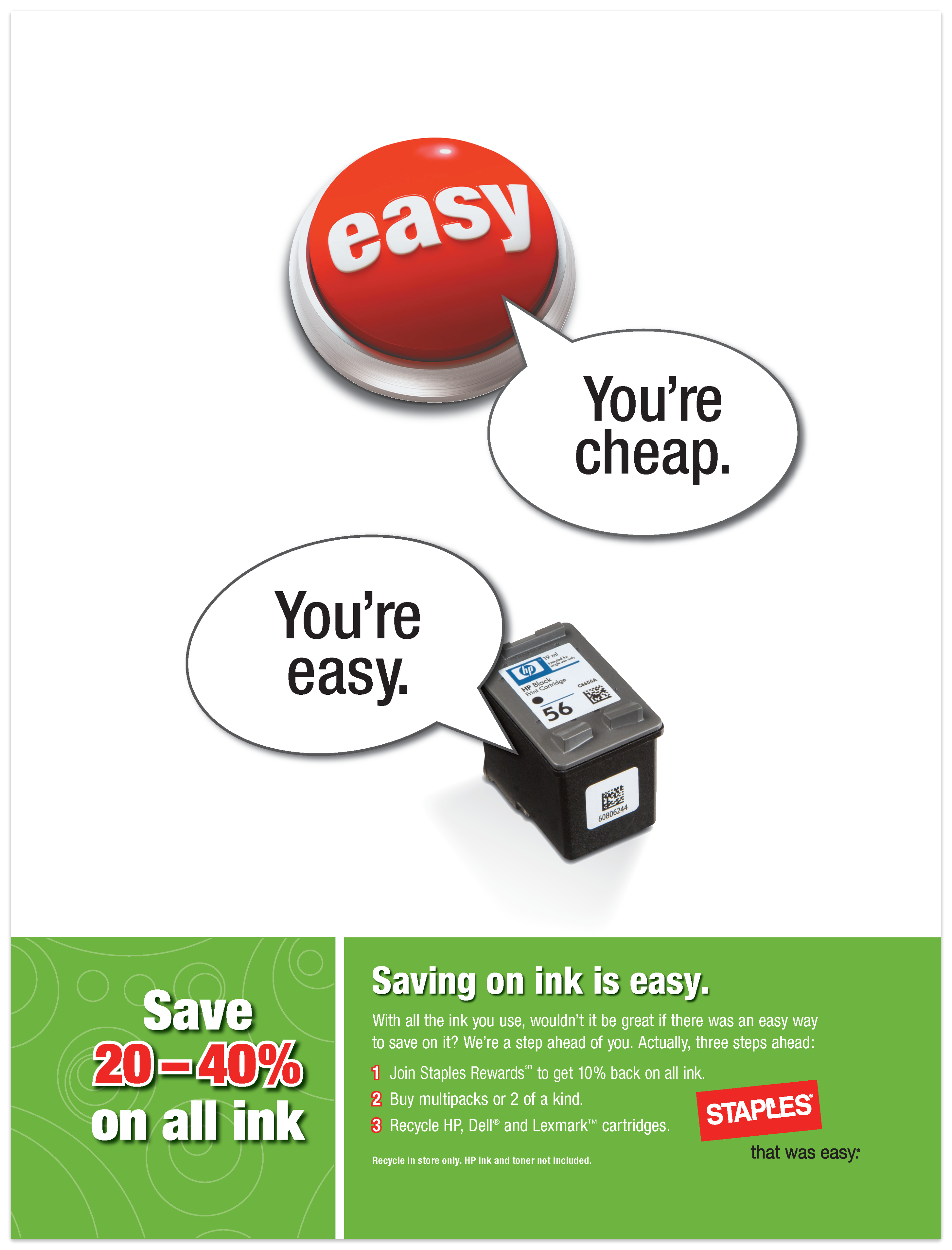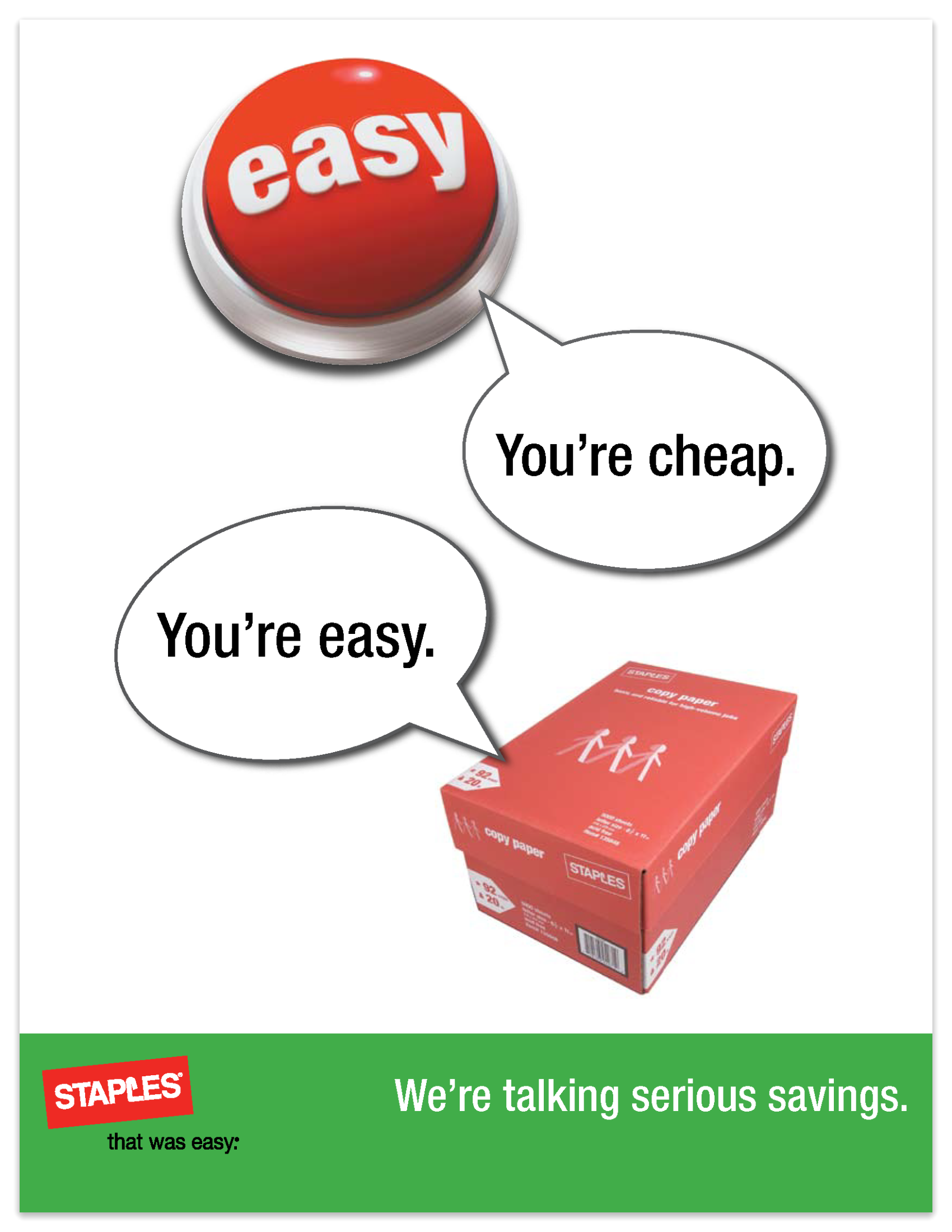 My "Cheap and Easy" ads kicked off what we fondly called the Talking Easy Button era of Staples. One ad in Time had the second-best customer retention of any ad in that issue and even snagged a Hatch Award nomination.