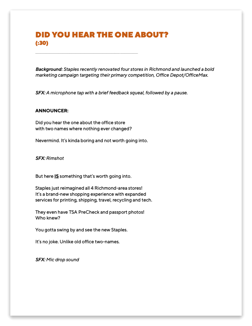 Over the years, I've produced and aired my fair share of radio spots — some of which I'm actually proud of. I've also had more that never made it out of review, but that I still loved. That's why this page of my portfolio is equal parts sound clips and scripts. Oh, and there may be a radio spot where I used text-to-speech VO. Enjoy!